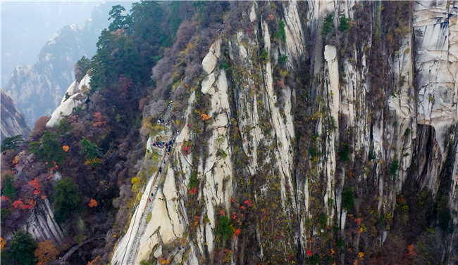 无人机缓缓腾起,翱翔在华山上空。在午后的阳光照耀下,浓雾逐渐消散,秋意已将层林尽染,秋霜为峰峦涂上缤纷的色彩,千峰逶迤犹如壮美的诗篇。