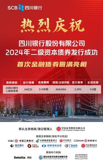 (记者 吉雪娇)12月10日,四川银行股份有限公司2024年二级资本债券在银行间市场成功簿记发行,发行规模54亿元,期限5 5年,主体评级与债项评级均为最高评级AAA,发行票面利率2.20%。