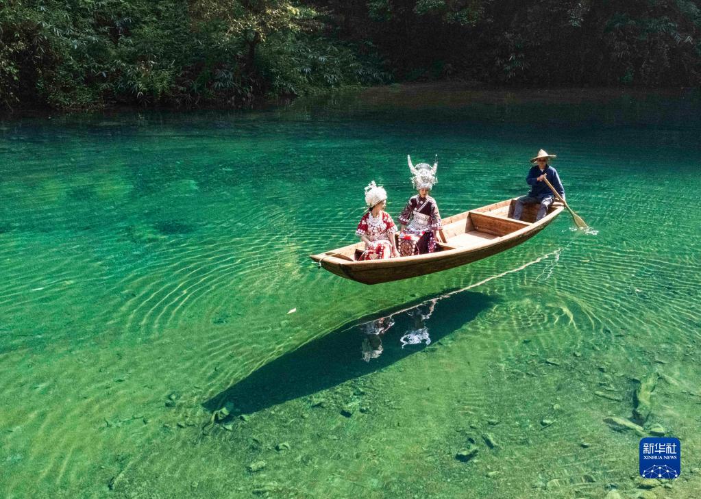 湖北省恩施土家族苗族自治州鹤峰县容美镇屏山村屏山旅游景区河水清澈见底,舟行水上如悬浮空中,美如画卷。