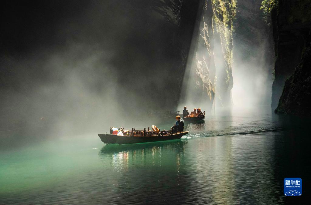 3月15日,游人在屏山村屏山旅游景区坐船通过雾中峡谷。