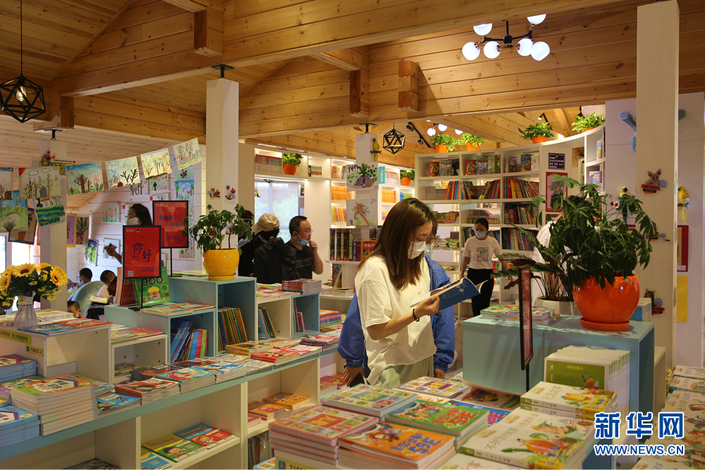 7月19日,读者在内蒙古赤峰市红山区的“猫”主题新华书店——喵屋书吧内选购图书。新华网 石毅摄