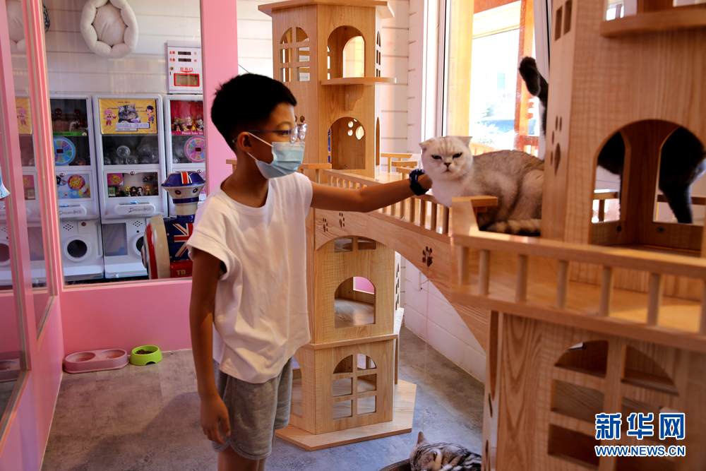 7月19日,在内蒙古赤峰市红山区的“猫”主题新华书店——喵屋书吧内,小朋友正在抚摸一只猫咪。新华网 石毅摄