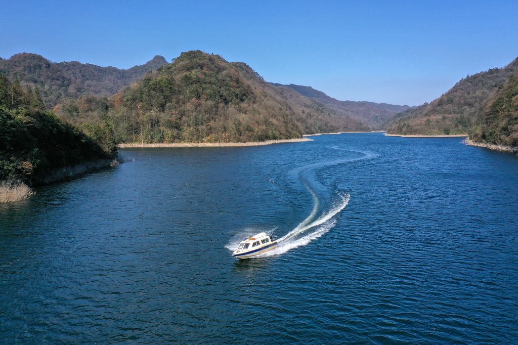 11月28日,贵州大沙河国家级自然保护区工作人员在湖面巡护(无人机照片)。新华社发(赵永章 摄)