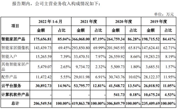 招股书显示,智能家居摄像机在2021年占全球市场份额约18%,处于市场前列,在2022年上半年其产销率高达110.99%;智能猫眼已连续多年在双11、618等购物节的天猫平台门镜/猫眼类目品牌排行中位列第一;智能门锁也多次入选双11、618等购物节天猫平台电子门锁类目品牌排行中位列前十,并在2021年618购物节天猫平台电子门锁类目品牌排行升至前三位;儿童陪护机器人在2021年618购物节中在天猫平台儿童机器人品类排行中位列前十。