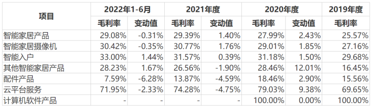 从毛利率来看,2019年至2022年6月,萤石网络的主营业务毛利率分别为33.81%、35.03%、35.14%和35.50%,呈现持续提升的态势。