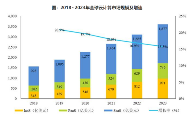 从全球市场上看,根据中国信通院的分析,2020年以IaaS、PaaS和SaaS为代表的全球云计算市场规模达到2253亿美元;预计未来几年市场平均增长率在18%左右,到2023年市场规模将超过3500亿美元。