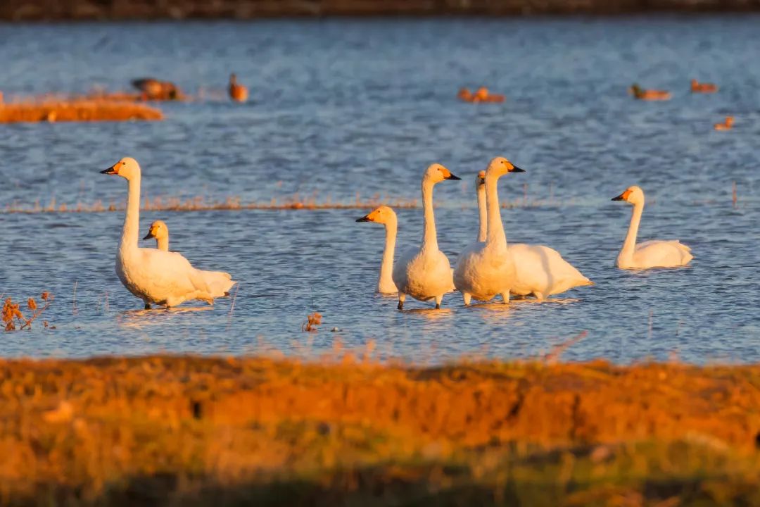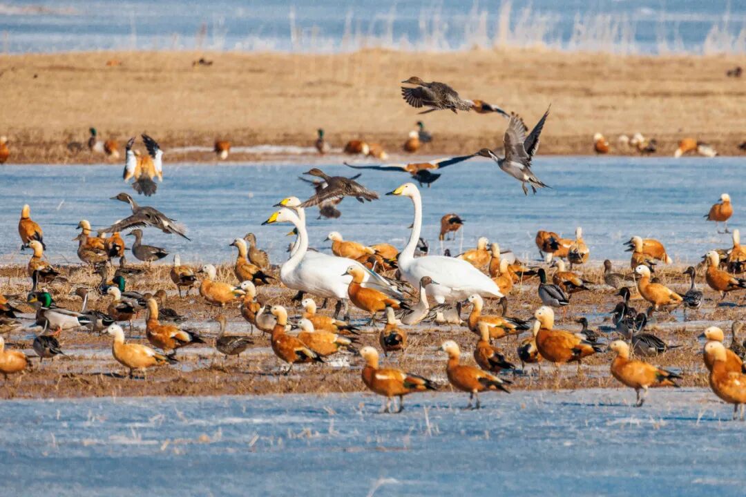 良好的生态环境吸引了多种珍稀候鸟停留,每年秋季都有大批雁群、鸭群在此聚集,天鹅觅食、灰鹤亮翅、赤麻鸭凌空飞舞,场面十分壮观。