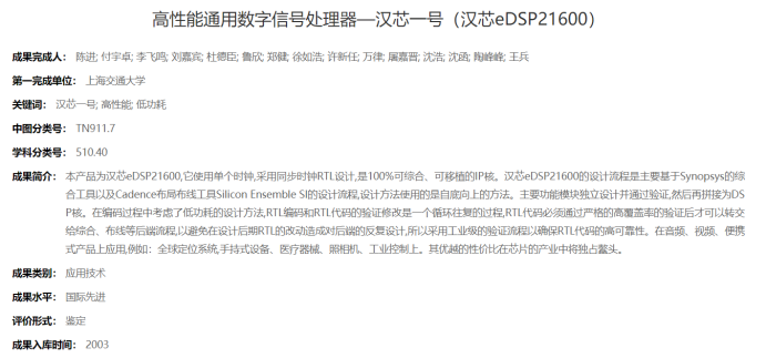在龙芯项目起步时,汉芯项目也在上海展开。而2003年,在龙芯1号发布半年之后,汉芯一号在上海通过技术鉴定。据专家认定"汉芯一号"及其相关设计和应用开发平台属于国内首创,达到了国际先进水平,其研制成功,标志着我国在 DSP 数字信号微处理器核心芯片上获得重大突破,填补了我国在高端通用 DSP 芯片上的空白。