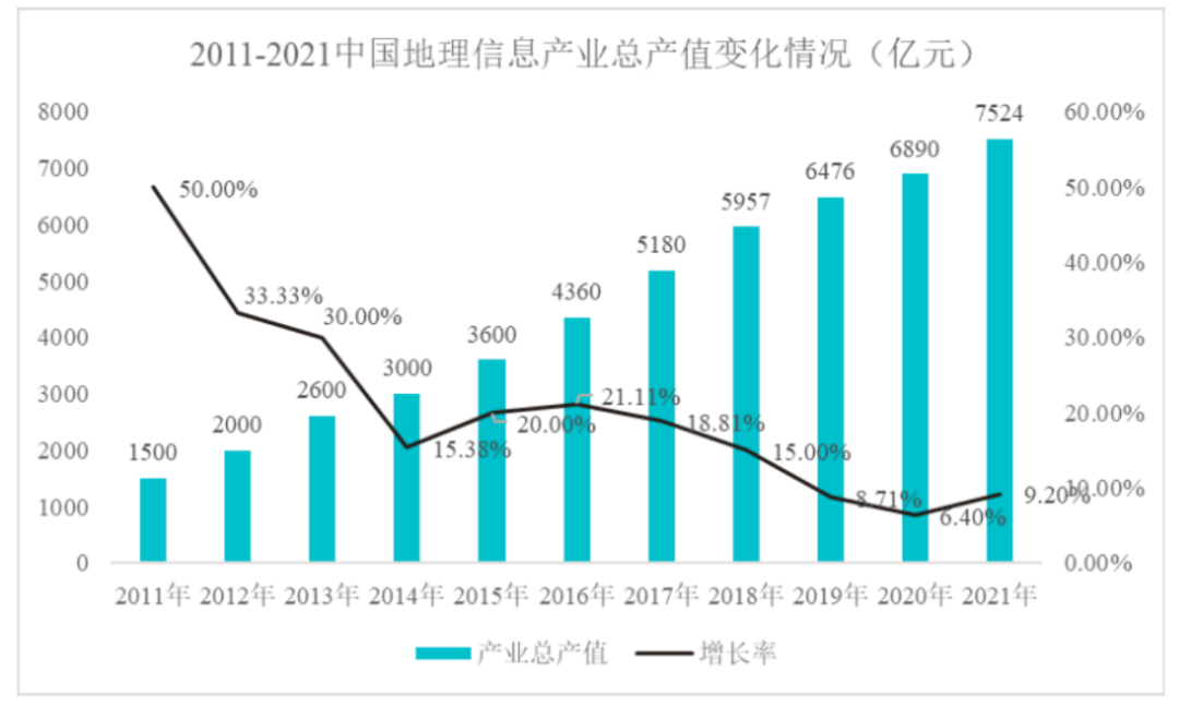地理信息技术广泛应用于智慧城市、智慧电力、智慧交通、智慧通信、城市规划等多个领域。地理信息产业的快速发展使得地理信息系统集成及软件也已形成千亿级的市场体量,根据中国地理信息产业协会数据,2021年我国地理信息产业产值达7,524亿元。