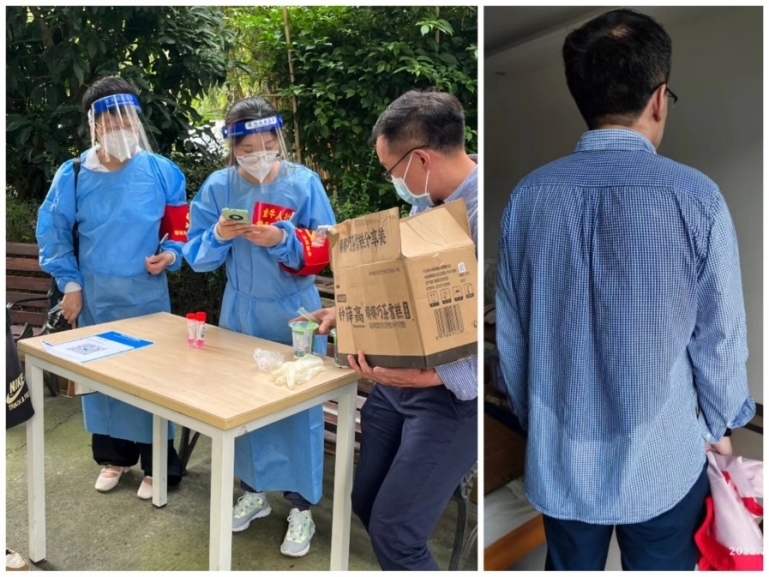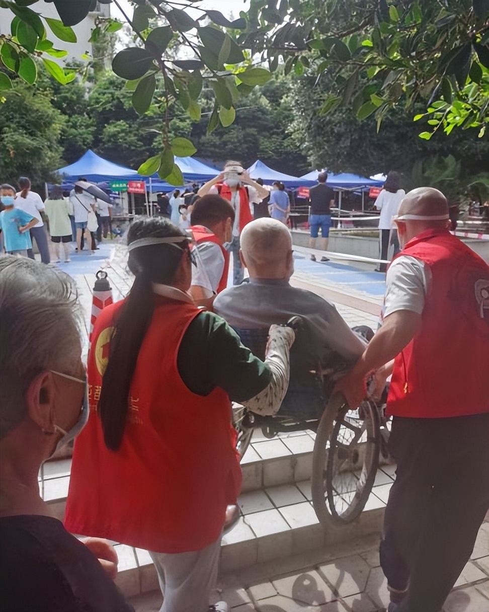 在府青街道桃蹊社区,成都银行志愿者抬着坐着轮椅的文大爷跨过检测点前的台阶,大爷动情的说:“没有你们,我和老伴儿真的还不知道怎么上来”;在华泰社区,志愿者入楼入栋,肩背手抬,协助行动不便的老年住户前往核酸检测点,有的老人家住六楼,没有电梯,志愿者便一楼一楼将老人背下了楼。